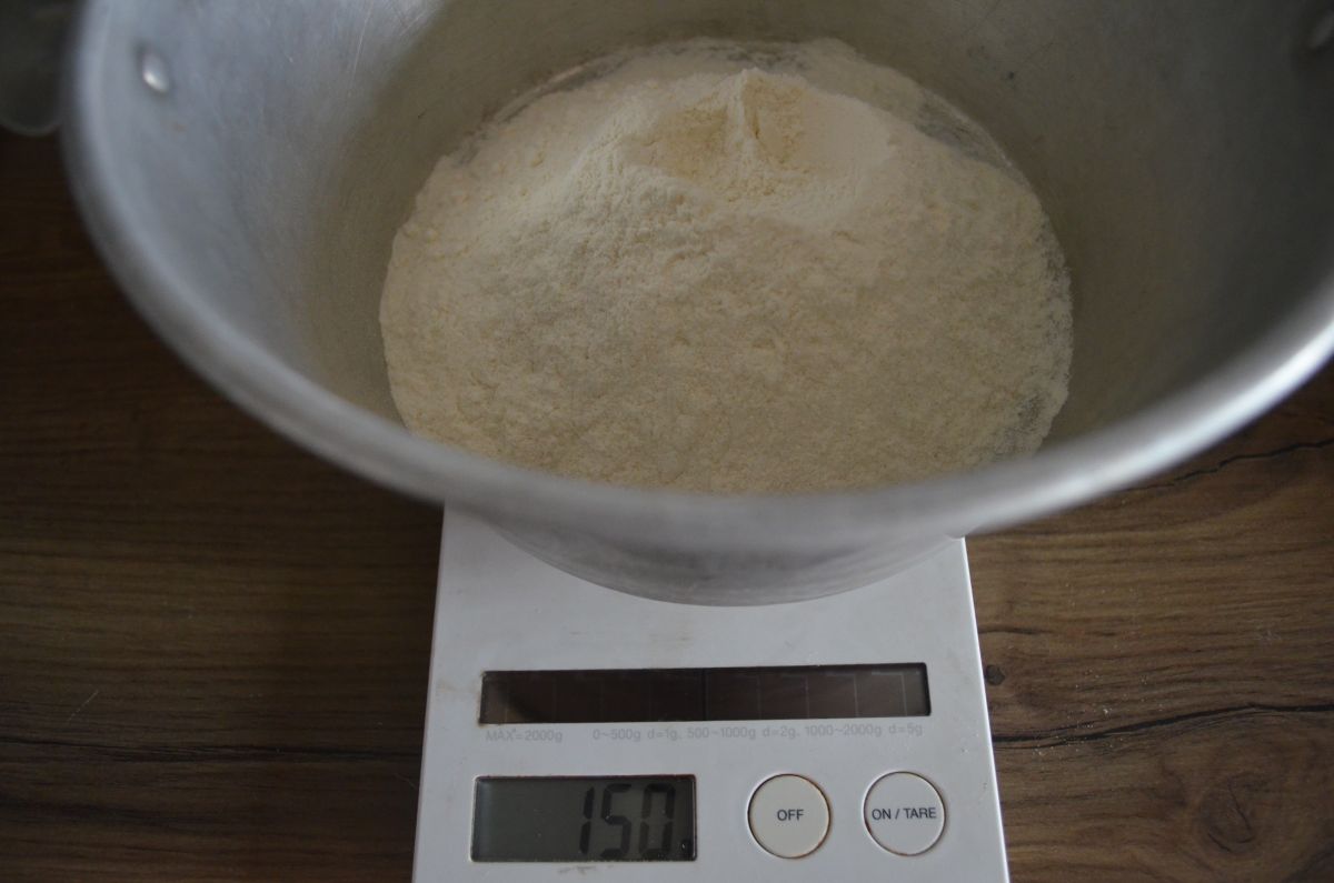1 – Posez votre saladier sur votre balance de cuisine et tarez. Versez 150 g de farine.
